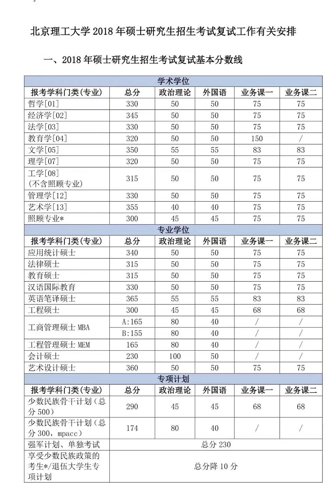 北京理工大學今日公布2018年復試分數(shù)線,如下: