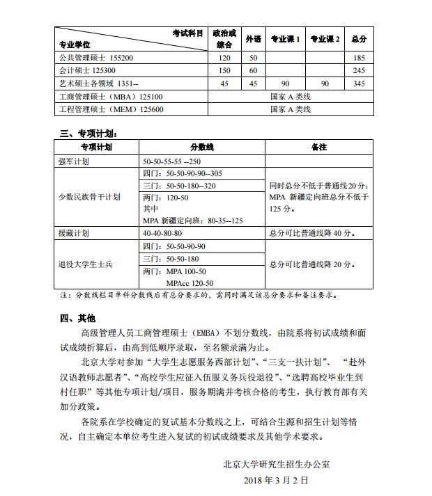 北京大學(xué)2018年碩士研究生招生復(fù)試基本分?jǐn)?shù)線如下: