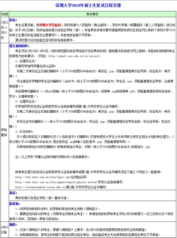 復(fù)試資格審查及日程安排詳見《深圳大學(xué)2019年碩士生復(fù)試日程安排》。