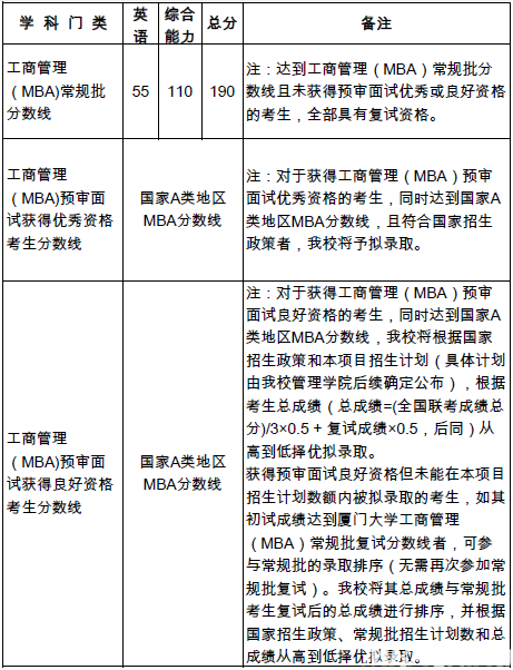 廈門大學2019年入學MBA研究生復試分數(shù)線,經(jīng)學校招生工作領(lǐng)導小組會議研究決定,劃分如下: