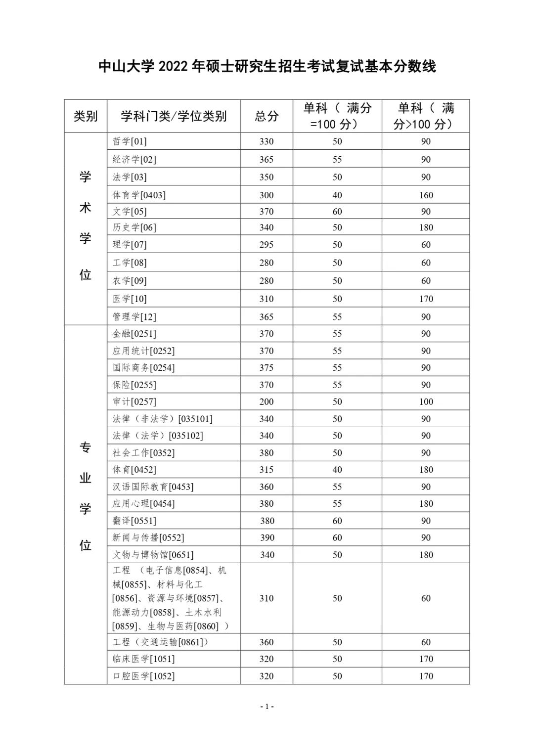 2022年中山大學研究生復試基本分數(shù)線院校動態(tài)
