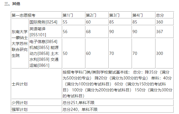 1. 各院(系)在達到上述學(xué)校復(fù)試基本線的生源充足情況下,可根據(jù)本學(xué)科、專業(yè)特點及生源和招生計劃數(shù),制定不低于學(xué)?;揪€的專業(yè)/方向復(fù)試線,考生須達到報考院(系)專業(yè)/方向復(fù)試線才能參加復(fù)試。具體專業(yè)/方向復(fù)試線以各院(系)復(fù)試細則為準。東南大學(xué)—蒙納士大學(xué)蘇州聯(lián)合研究生院、士兵計劃、少民計劃、強軍計劃以學(xué)校復(fù)試基本線為準。