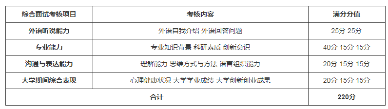 3.復(fù)試總分220分,考核項(xiàng)目及分值見下表: