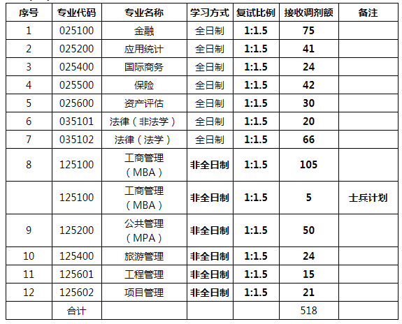 (六)第一志愿報(bào)考工商管理、公共管理、旅游管理、會(huì)計(jì)、圖書情報(bào)、工程管理、項(xiàng)目管理、物流工程與管理和審計(jì)專業(yè)學(xué)位碩士的考生,在滿足調(diào)入專業(yè)報(bào)考條件、且初試成績同時(shí)符合調(diào)出專業(yè)和調(diào)入專業(yè)在調(diào)入地區(qū)的全國初試成績基本要求的基礎(chǔ)上,可申請(qǐng)相互調(diào)劑,但不得調(diào)入其他專業(yè);其他專業(yè)考生不得調(diào)入以上9個(gè)專業(yè)。