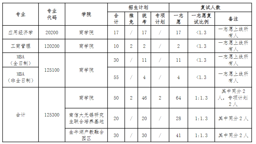 根據(jù)教育部關(guān)于研究生錄取工作中要堅(jiān)持“按需招生、德智體全面衡量、擇優(yōu)錄取、寧缺毋濫”的原則及相關(guān)規(guī)定,為保證我院碩士研究生招生工作的順利進(jìn)行,提高招生工作效率和保證生源質(zhì)量,既維護(hù)考生權(quán)益,又保證公平、公正、公開,根據(jù)南京信息工程大學(xué)2022年招收攻讀碩士學(xué)位研究生復(fù)試及錄取工作相關(guān)文件,結(jié)合我院實(shí)際情況,經(jīng)我院研究生復(fù)試工作領(lǐng)導(dǎo)小組討論,特制定020200應(yīng)用經(jīng)濟(jì)學(xué)、120200工商管理、125100工商管理碩士(MBA)、125300會計(jì)專碩四個(gè)碩士專業(yè)復(fù)試及錄取工作細(xì)則。一、招生指標(biāo)、復(fù)試比例及復(fù)試名單確定根據(jù)研究生院相關(guān)文件,實(shí)行差額復(fù)試,復(fù)試名單以研究生院公布的名單為準(zhǔn)。各專業(yè)招生計(jì)劃及復(fù)試名額如下: