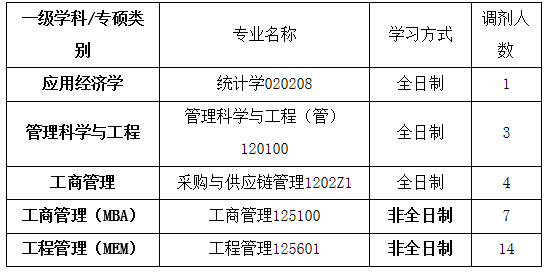 我校在4月6日調(diào)劑系統(tǒng)開放后開始進行調(diào)劑錄取,還有如下學(xué)科有調(diào)劑名額(理論經(jīng)濟學(xué)、應(yīng)用經(jīng)濟學(xué)學(xué)術(shù)學(xué)位另行通知),歡迎有意愿的考生申報。