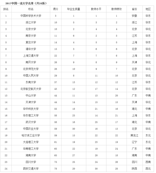 這里提出的2017年中國一流大學(xué)的標(biāo)準(zhǔn)與上年相同:在中國大學(xué)評價中,同時滿足以下三個條件的大學(xué):1。教師學(xué)術(shù)水平居全國大學(xué)前30名。2。教師教學(xué)科研效率居全國大學(xué)前30名。3。本科畢業(yè)生質(zhì)量居全國大學(xué)前30名。