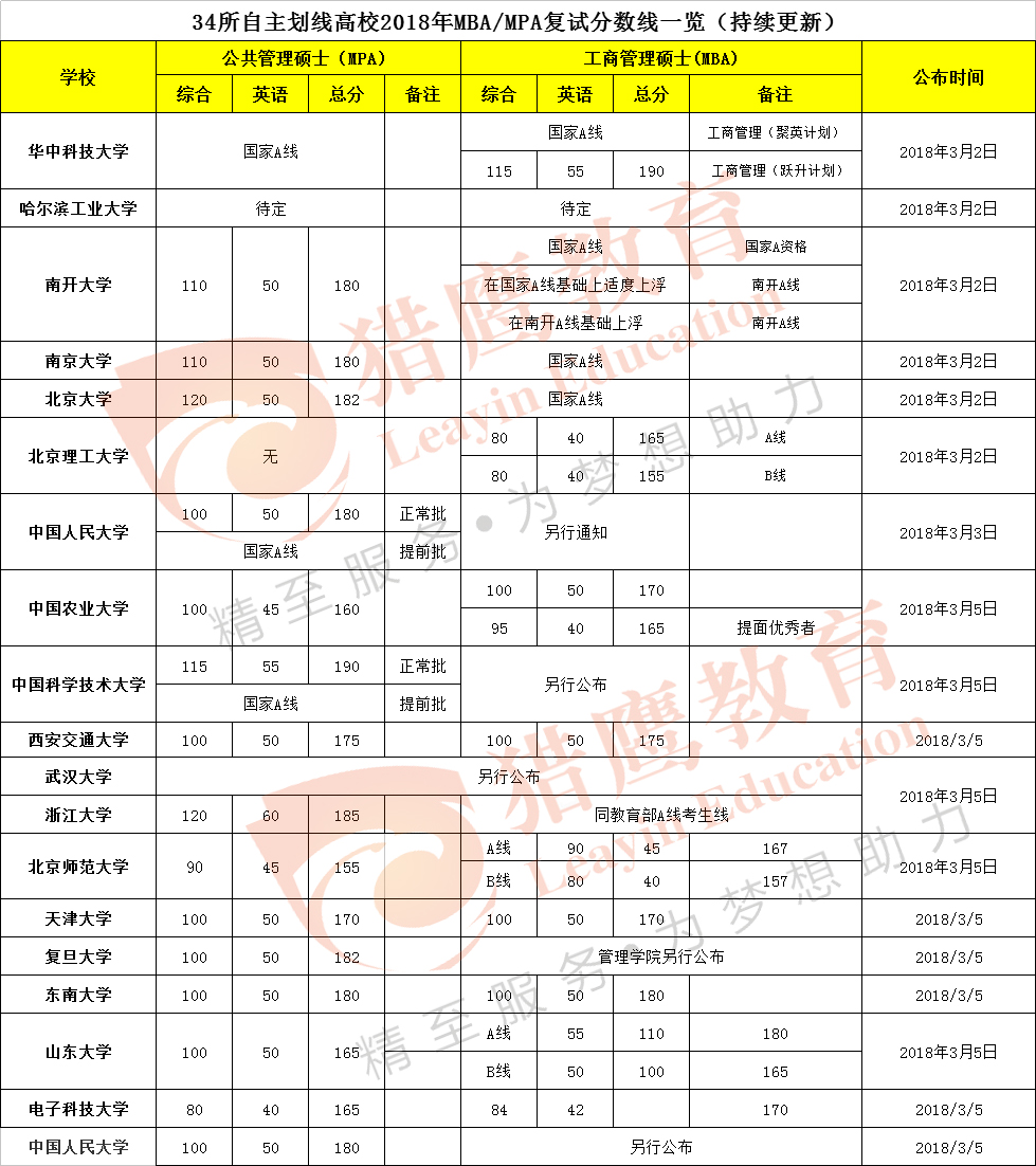 34所自主劃線高校MBA/MPA/EMBA分?jǐn)?shù)線匯總(持續(xù)更新)考研新聞